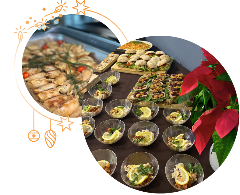 Planujesz domową Wigilię albo firmowe spotkanie świąteczne? Z radością przygotujemy dla Ciebie tradycyjne dania wigilijne, świąteczne przysmaki i eleganckie przekąski — idealne na rodzinny stół, rodzinne spotkanie lub firmową wigilię. Jeżeli urządzasz święta w domu, dostarczymy gotowe zestawy; gdy planujesz firmowe świętowanie, zajmiemy się pełną obsługą — od dań, przez zastawę i dekoracje, aż po serwis.