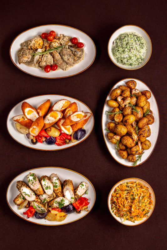 Starannie skomponowany zestaw ciepłych dań dla gości ceniących klasyczną kuchnię w eleganckim wydaniu. W pakiecie znajdują się trzy wyraziste dania mięsne: delikatna pierś z kurczaka w sosie śmietanowo-pieczarkowym, soczyste cygaro wieprzowe z fetą i boczkiem oraz klasyczny kotlet Devolaille z serem cheddar. Całość uzupełniają aromatyczne ziemniaki, świeże surówki oraz grillowane warzywa.